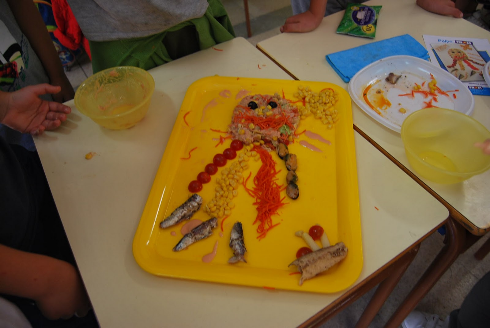 En la 2ª quincena de octubre nos visitaron unos representantes de las oficinas del FROM, del Ministerio del Medio Ambiente. Nos enseñaron muchas cosas, entre ellas cómo cocinar una lubina a la sal, a limpiar boquerones, a distinguir un pescado fresco… Por último hicimos el dibujo de un pulpo con ingredientes vegetales y una latilla de atún. Una vez acabado el taller nos lo comimos y estaba ¡riquííííísimo!